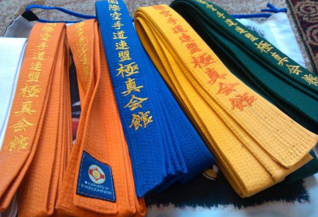 Система цветности ученических поясов отличается от системы цветности в других стилях и школах и имеет более глубокое значение, чем переход от светлого цвета к тёмному при увеличении степени. Цвета ученических поясов объединены в пять групп, имеющих один цвет, на пояс, соответствующий более старшему кю, нашивается полоска цвета более старшей группы (исключение — пояс 1-го кю имеет жёлтую полоску, хотя можно увидеть и чёрную). Также в некоторых школах 10-9 кю соответствует оранжевый пояс, а белый пояс носят ученики, не имеющие кю.