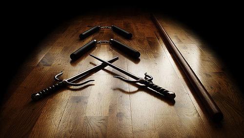 Нунчаки, бо и саи - традиционные предметы оружия крестьян Окинавы, прототипом которых служили предметы быта