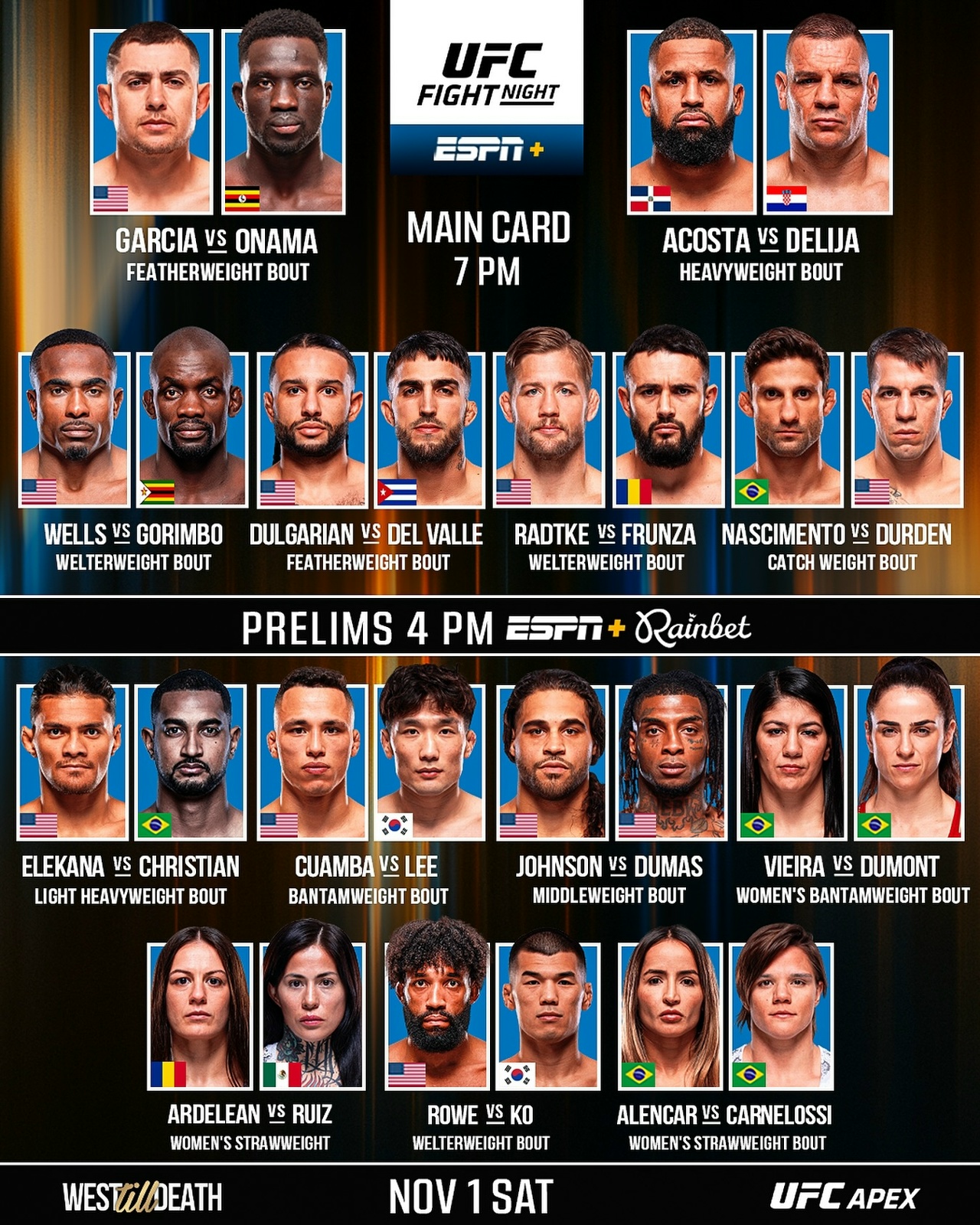 В ночь с 1 на 2 ноября в Лас-Вегасе (штат Невада, США) состоится турнир UFC Fight Night 263, главным событием которого станет пятираундовый поединок в полулегком весе между американцем Стивом Гарсией и угандийцем Дэвидом Онамой.